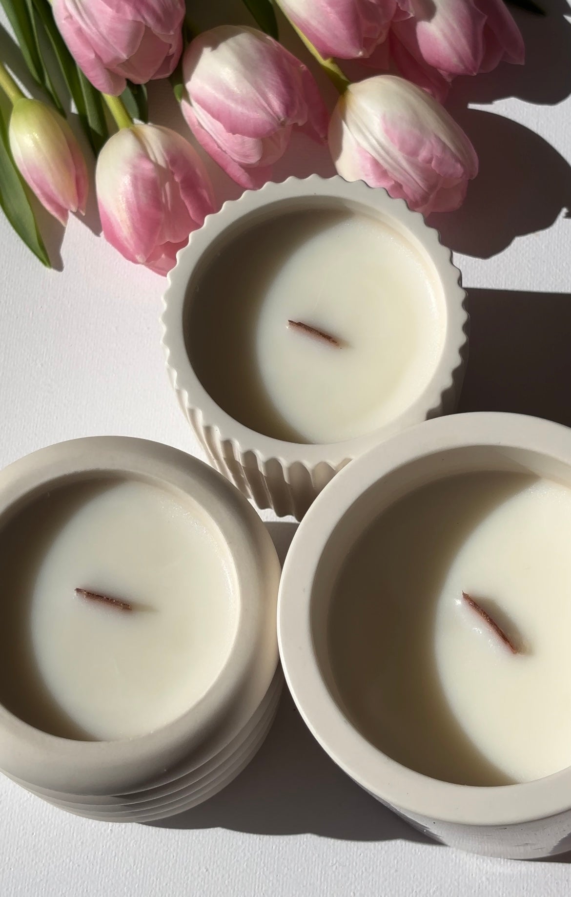 J'utilise exclusivement de la cire végétale de soja/coco, des parfums français de Grasse, des mèches en bois ou coton, et de la jesmonite pour les objets de décoration.
