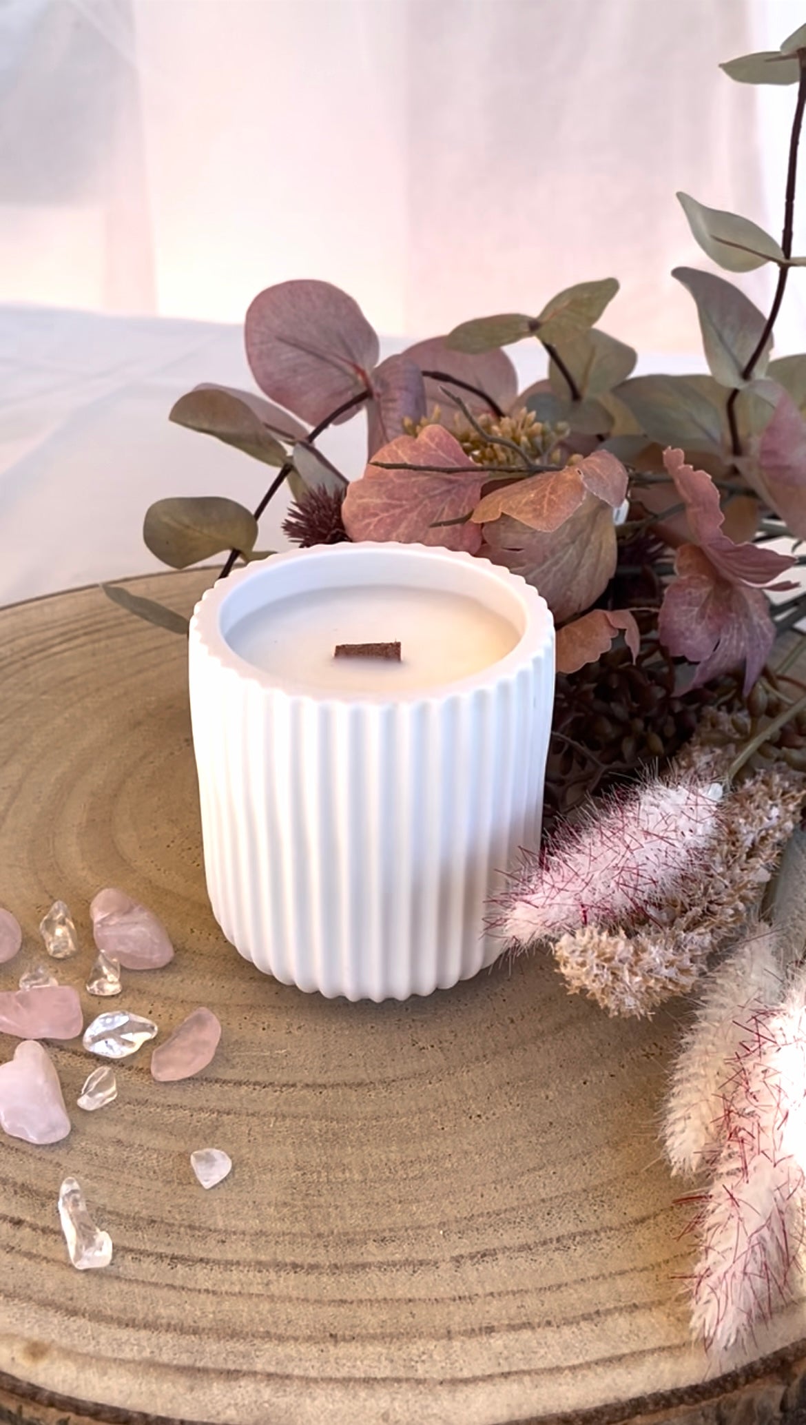 Ingrédients : cire naturelle et végétale de soja/coco (sans essai sur les animaux), parfum de Grasse (sans paraben ni phtalates) et mèche en bois (certifiées FSC).